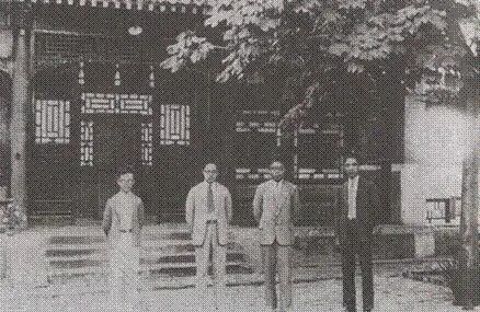 1935年严济慈(前排右一)与学生郑大章(后排左一)、杨承宗(后排左二)在物理研究所合影。