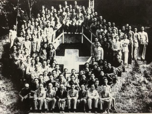 1945年救护总队部工作人员在贵阳图云关围着红十字徽标留影
