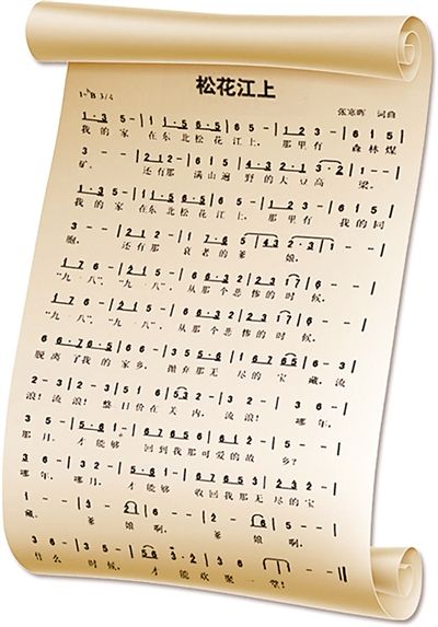 “我的家在东北松花江上,那里有森林煤矿,还有那满山遍野的大豆高粱……九一八,九一八,从那个悲惨的时候,脱离了我的家乡,抛弃那无尽的宝藏,流浪!流浪……”