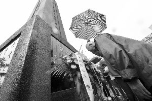 两地7位老兵冒雨来到第74军常德会战阵亡将士纪念塔祭拜 赵杰/摄