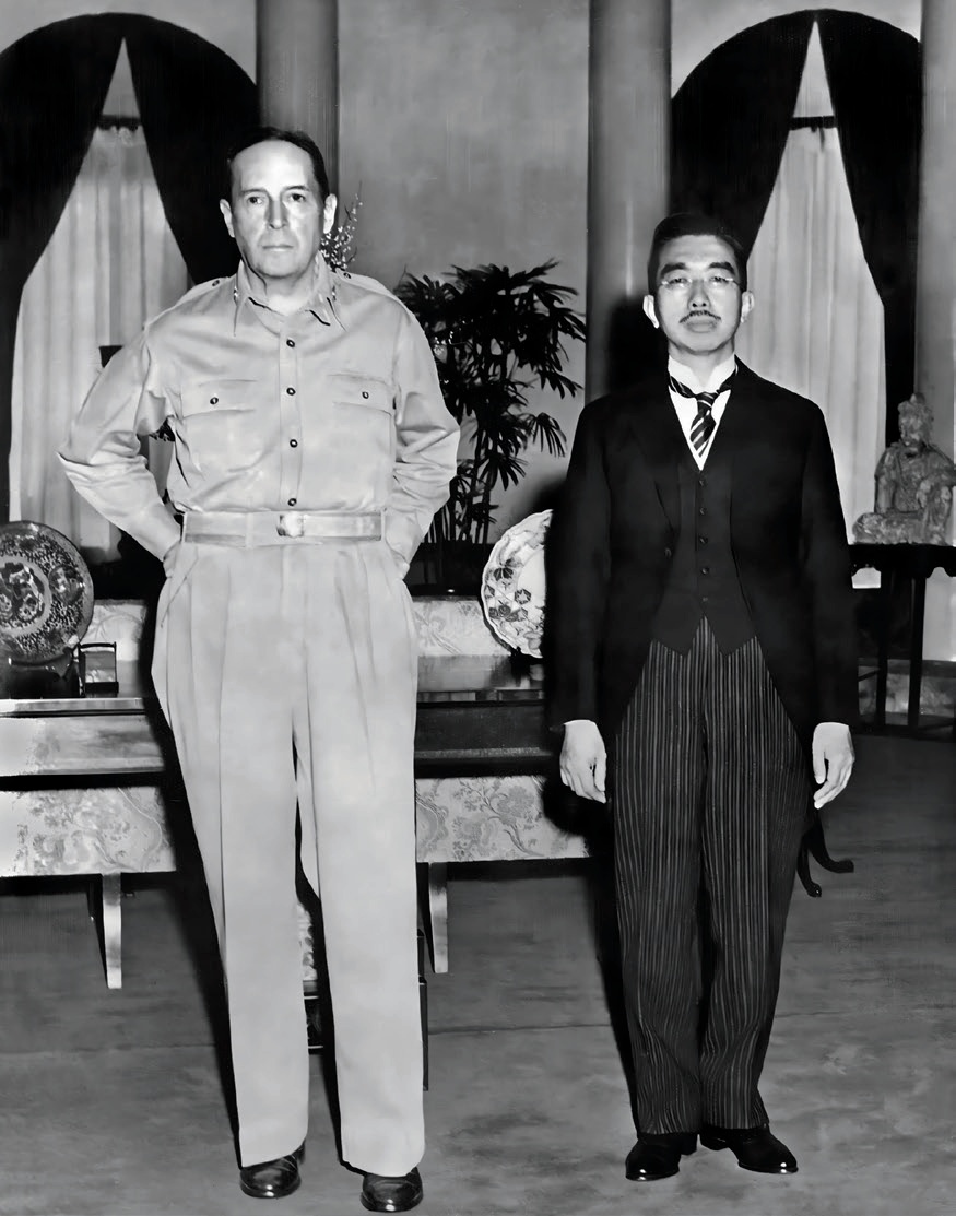 1945年9月27日,驻日盟军最高司令官麦克阿瑟与昭和天皇在美国驻日本大使馆会晤,后者摆出顺从与合作的姿态。随后,两国关系走向美国控制、改造和庇护日本,日本依靠美国恢复国力的阶段。美国不仅在东京审判中始终反对将天皇列为战犯被告,还默许并协助日本采取各种措施为天皇脱罪。图为此次会面两人合影 视觉中国/供图