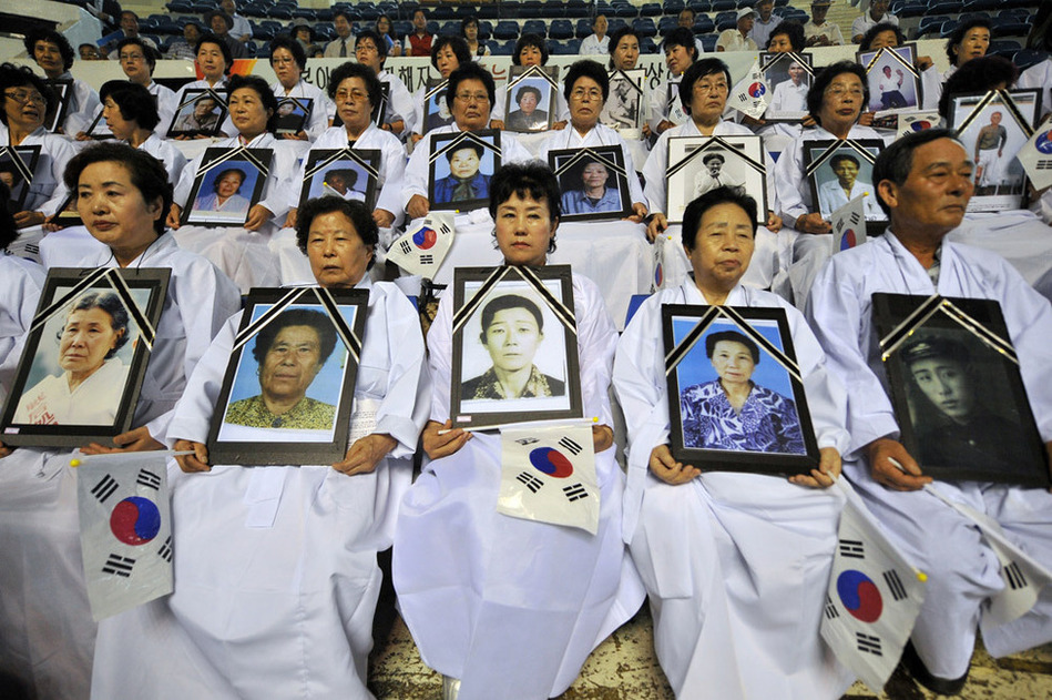 部分韩国二战遗属手捧亲人遗像,参加反日集会