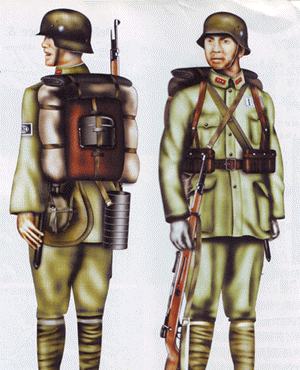 先说中国军队,当时的中国军队虽然说名义上是统一的编制,实际上各个派系之间还是有着很大的区别。别的且不说,就连最起码的军装颜色,各派系就是五花八门各不相同,中央军的夏季军服主要以黄绿色为主,冬季则主要是蓝灰色棉军服。地方杂牌部队中北方部队大多是蓝灰色军服,南方的两广部队是土黄色,而云南的滇军则是蓝绿色。连个军服颜色都搞得这样杂乱,还谈什么其他的单兵装具。相比较来说,自然是中央军比较正规一些,好歹还有些政府军的气度。不过就拿当时的情况来看,就拿中国军队最高标准的中央军精锐部队来说,单兵标准个人装具也就五大件,钢盔、子弹带、水壶、干粮袋和防毒面具。