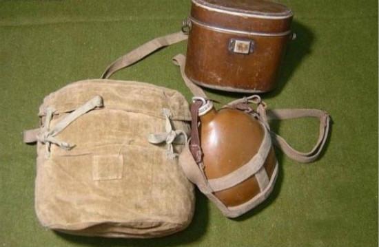 日军的饭盒也是一件品质相当高的装具。它由4个部件组成,2个可以套在一起携带的饭盒,其中1个可以煮饭,另1个煮汤,还有2个容量是盒盖一倍的托盘。饭盒上有前支架用来将其固定在背包上,还有提手(日军称为“钓手”)可以吊着饭盒用于加热。饭盒为铝制,分军官和士兵两种样式。