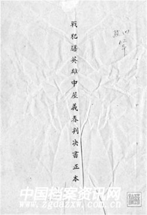 1946年9月3日,徐州绥靖公署审判战犯军事法庭对于日本战犯徐州宪兵队大佐队长膳英雄、战务科长中屋义春的判决书正本。(江苏省档案馆提供)