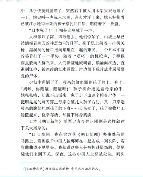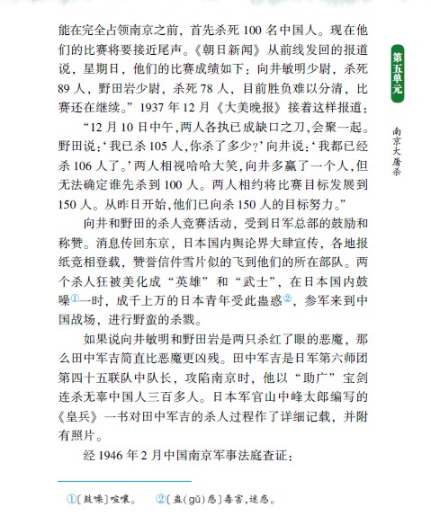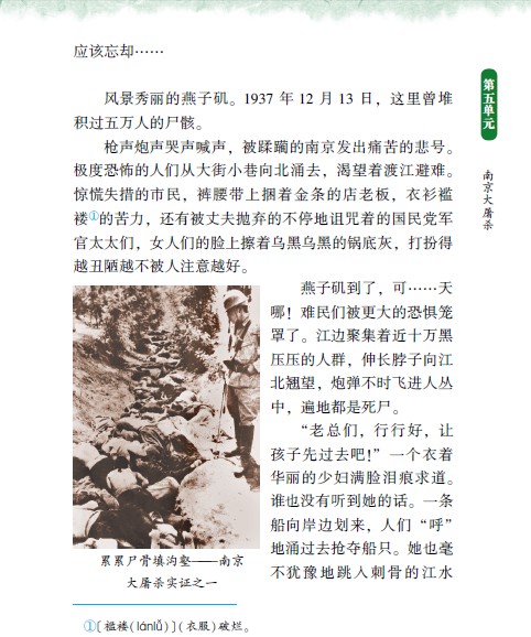 出版社表示,“两篇课文体裁、题材相同,写作角度和表现手法不同,一个着眼于面,一个立足于点,从而让学生更加全面而深刻地认识日本帝国主义的侵略罪行,激发学生的爱国主义情怀,培养他们的爱国主义精神。”