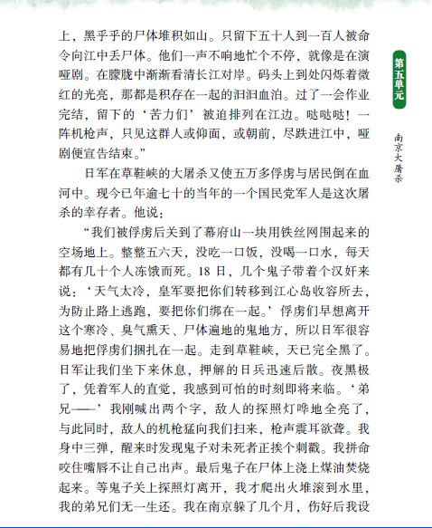 答:由于南京一文是八年级下册教材中的课文,要两年后才会使用,目前还处于修改完善、听取意见的阶段。我们曾有这样的考虑,将温书林所写的《南京大屠杀》一文换成张纯如所写的《南京大屠杀》片段节选,课文题目暂拟为《死里逃生》,更换的原因是,张纯如所写的《南京大屠杀》节选不仅描写了日本帝国主义的惨无人道,而且刻画了一个普通中国妇女李秀英在日本侵略者暴行面前智勇双全勇于反抗的事迹,感人至深,反映了伟大的中国人民抗击外来侵略的坚强决心和英勇无畏的精神。