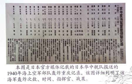 日军1940年轰炸重庆日志图 该图是日本官方媒体记载的日本华中舰队报送的1940年海上空军部队轰炸重庆记录,该图详细列明了该海军轰炸次数、时间、指挥官、战果。我们可以清晰地看到,1940年4月22日至8月9日,重庆所经历的26次屠杀式轰炸。