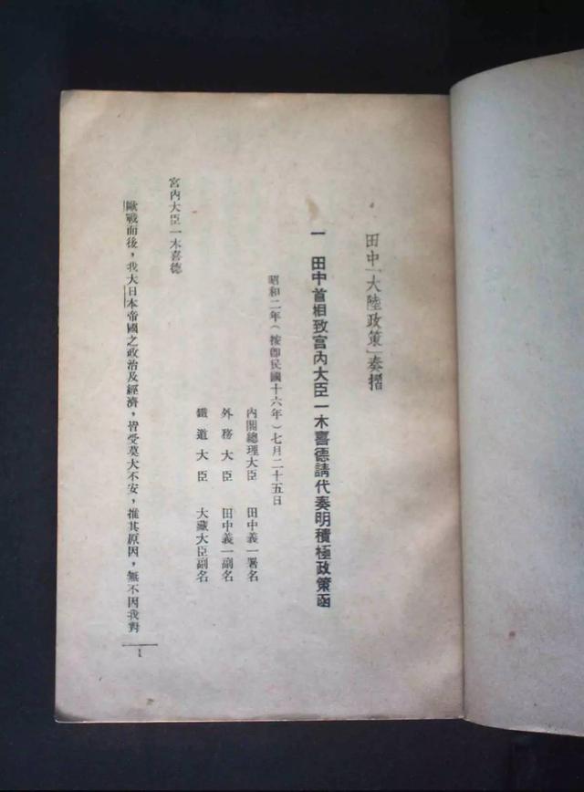 这段猖狂的侵略“宣言”,出自臭名昭著的《田中奏折》,《田中奏折》原件称《帝国对满蒙之积极根本政策》。1927年,日本田中内阁炮制的这份《帝国对满蒙之积极根本政策》,历来被看做日本侵华的“纲领性文件”。