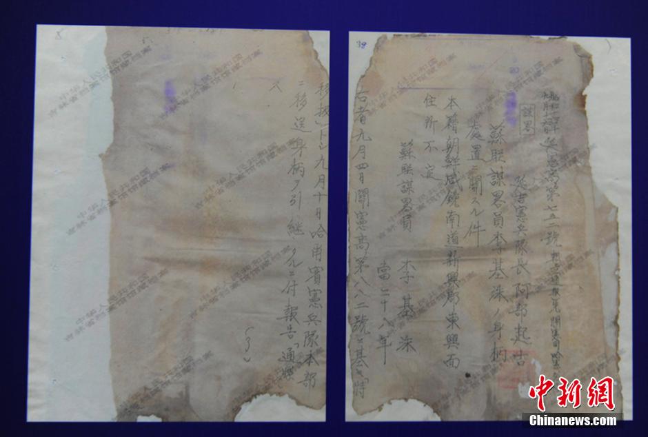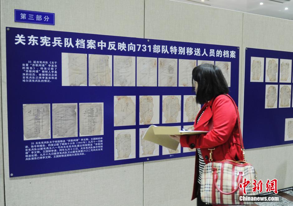 近日,吉林省档案馆公布的新近发掘档案显示,日本侵华期间,关东宪兵队等军警机关不经法庭审判就将抓捕的抗日人士及其他人员“特别移送”到731细菌部队进行活体试验。目前吉林省档案馆馆藏反映“特别移送”内容的档案近200件,涉及277人,大部分为中国人,还有朝鲜人、前苏联人,本次公布的只是其中的4件。图为反映日军细菌实验档案影印件。中新社发 张瑶 摄