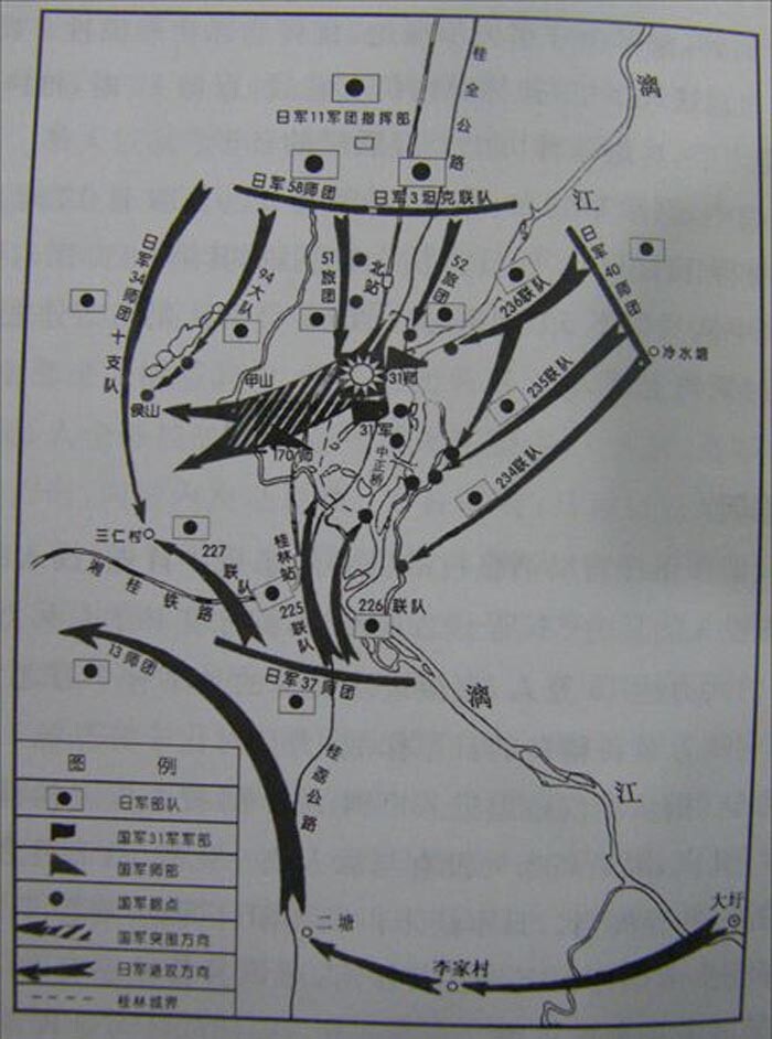 (一)向衡阳外围雨母山反攻失败后退回广西桂林东乡大圩一带的新编第十九师(属于第四十六军的一个师,少将师长蒋雄)作为策应桂林的城外的机动部队。