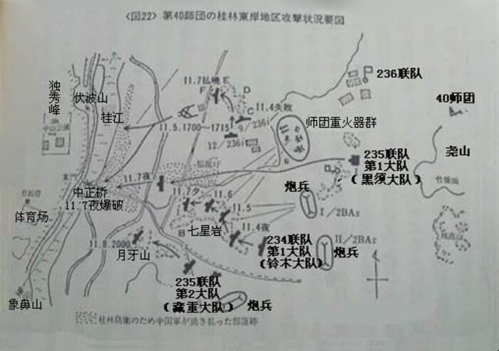 上图为日军第40师桂林东岸地区攻击状况要图。