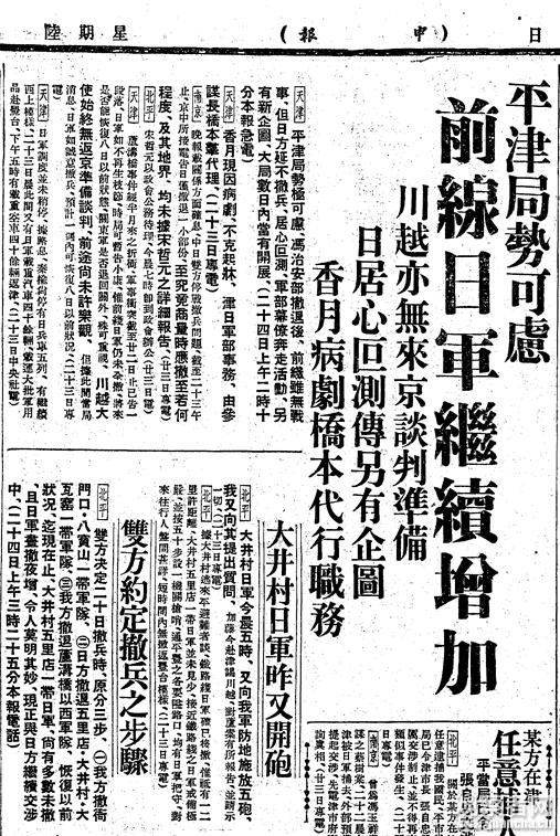 [天津]平津局势极可虑。冯治安部(时任国民革命军29军37师师长、兼河北省政府主席——观察者网注)撤退后,前线虽无战事,但日方延不撤兵,居心叵测;军部慕僚奔走活动,另有新企图,大局数日内当有开展。(二十四日上午二时十分本报急电)