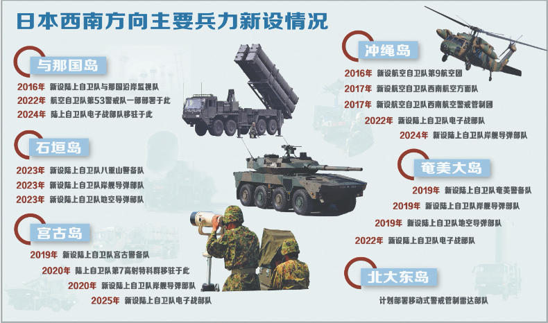 一段时间以来,日本持续渲染“西南方向局势紧张”,借“防卫”之名,行扩张之实,加速将军事战略重心向西南方向转移。通过系统性的兵力部署调整、先进装备进驻、军事设施建设以及针对性的演训活动,日本已逐步将琉球群岛打造为攻防兼备的“军事堡垒”。