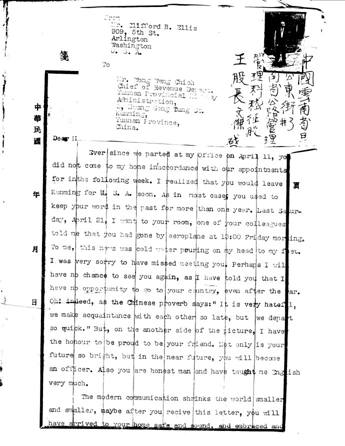 这是一位美国飞虎队飞行员的后人希望找到父亲在70多年前在昆明的一位中国朋友的来信。抗战时期,这位CliffordB. Ellis(克莱福德·B·埃利斯)是一名飞虎队员,在昆明结识了一位叫作王文杰先生,他当时是云南省公路管理局稽征股股长。