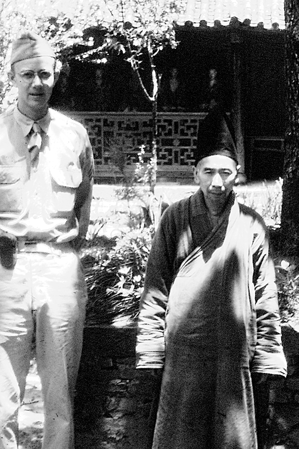 The Chinese friends wouldtake Clifford and sometimes other American airmen to see the sightsaround the country side. There were Taoist,Buddhist, and Confucian temples in the area. Using a Leica 35 mm camera, Staff Sargent Clifford B. Ellis tookpictures of the temples, the people, and the cities inChina. Mr. Wong and Clifford shared the interestin photography and Clifford was able to teach Mr. Wong skills hehad learned in taking better pictures. During oneof these outings, one of his friends took a picture of StaffSargent Clifford B. Ellis with a Buddhist monk.