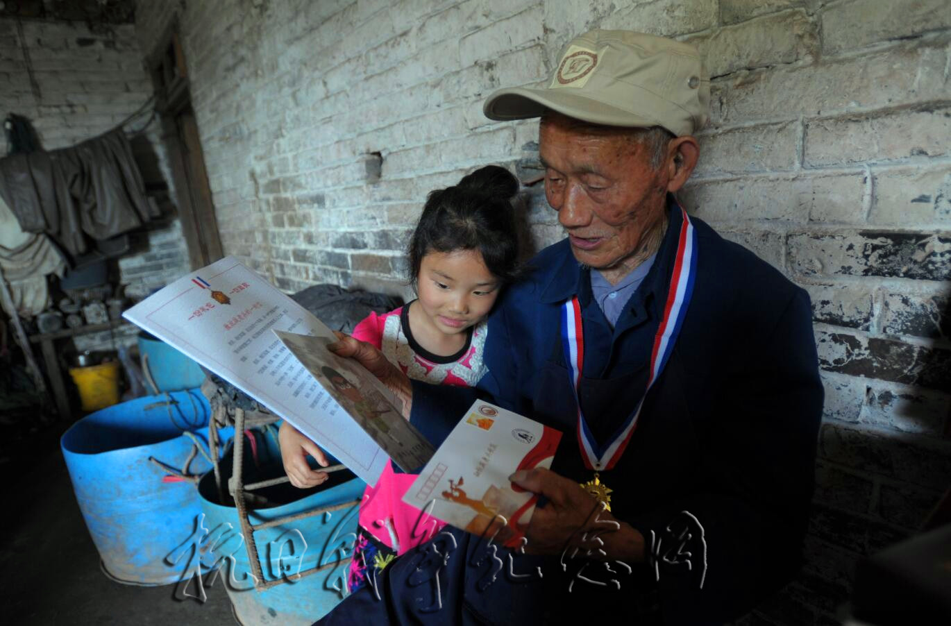 1944年年5月,198师592团横渡怒江,参加了灰坡战斗,仰攻高黎贡山,腾冲血战,腾冲血战有好几十天,与日军反复争夺等战役,老人说他们晚上出击的时间较多,经常一天都吃不到饭,饭送到阵地上,都是用帽子装饭,用手抓起来吃。一次全班在一个院坝吃饭,一颗炮弹落下来,因为我个子小,蹲在墙角边,没有被炸死,其他战友都遭炸死了。高黎贡山战斗中至今手臂还有一颗弹头(嵌在肌肉里摸得着),背上三处弹片是在腾冲负的伤,老有反复说战争打得非常惨烈,战友多人牺牲(说到此处老人流泪满面)。儿子说曾经在医院照过片,想取出来,医生说片子上有几处发亮和地方,不知是子弹还是弹片。