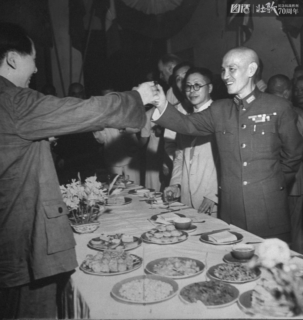 1945年9月3日晚,重庆举行了胜利日欢庆晚宴。图为晚宴上蒋介石亲自向中共首领毛泽东敬酒。庆祝活动从白天持续到了夜晚,而如此大规模的庆祝胜利活动,重庆连续进行了三天。