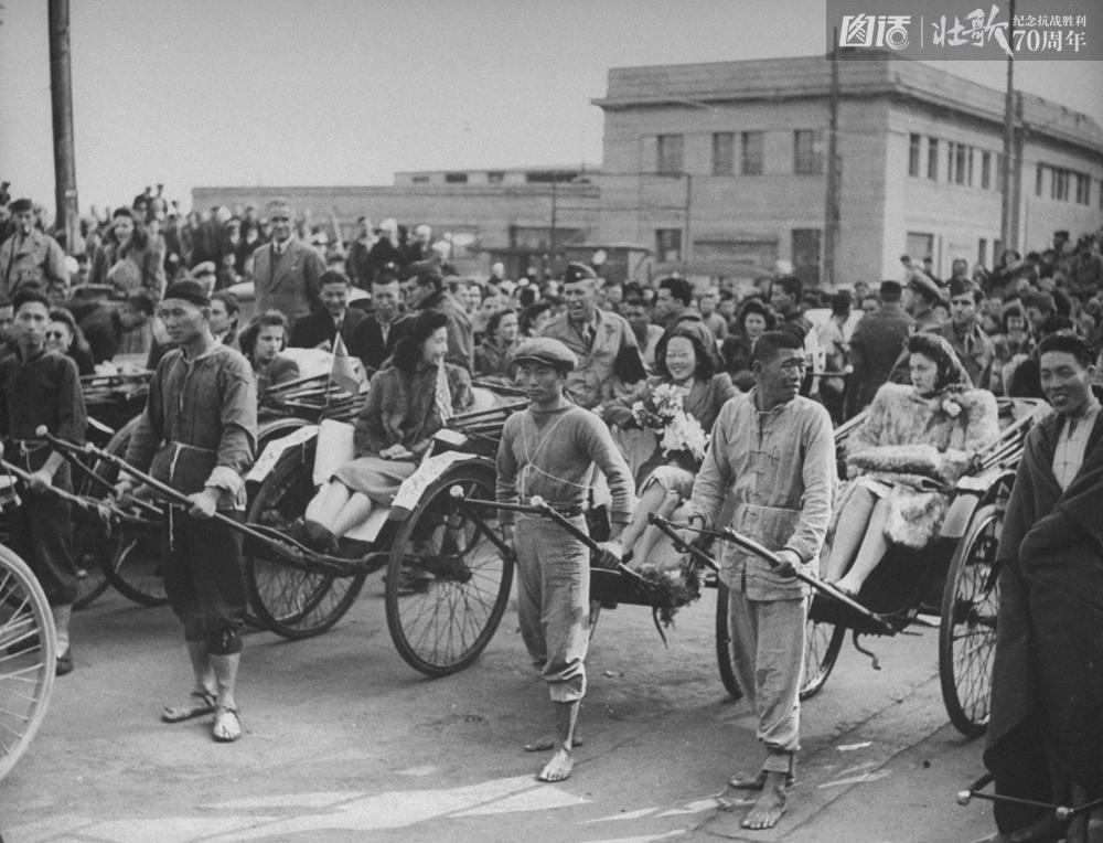 上海市民还自发组织了黄包车拉力大赛来庆祝抗战胜利。图为1945年11月,上海,比赛现场的参赛者和围观者。