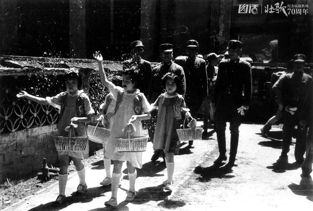 战争胜利后,中国军队凯旋还都时,当地还会举行欢迎仪式,庆祝胜利。图为1945年9月,中国军队返回宜昌,受到了当地民众的欢迎。担任前导的女童依西方习俗手摇花篮,将篮里的鲜花花瓣向外飘洒,象征胜利的喜悦与芬芳。