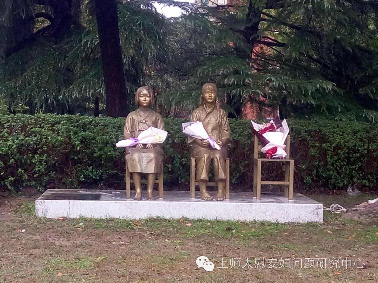 采访完成后,两位老人冒雨来到上海师范大学文苑楼前,与中韩雕塑师一起,为 “慰安妇”和平少女铜像揭幕。这组雕塑由中国少女、韩国少女和一把空椅子组成;中国少女像的后面镌刻着采自各地幸存者的脚模。雕像设计者之一、清华大学潘毅群教授介绍,这组雕塑去年秋天已树立在首尔街头,这是同一类型雕塑的第二组,也是中国大地上树立的第一座中韩“慰安妇”受害者雕像。未来这组雕塑还将出现在世界各地。