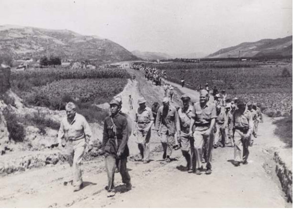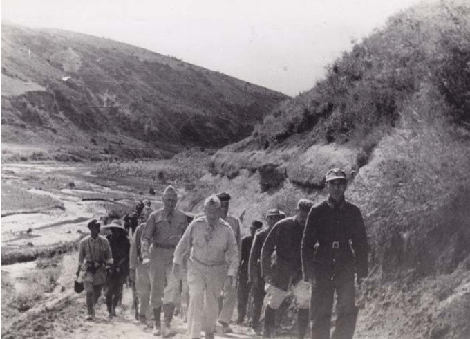 美军观察组人员和第359旅旅长王震将军一起上山,他们可以在那里观看演习。第18集团军参谋长叶剑英将军(穿白色马裤者)也在人群中。