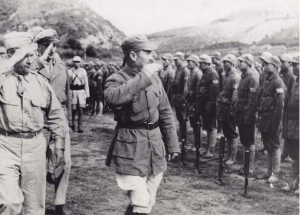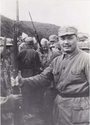 参谋长叶剑英将军检查过日本步枪后,递还给第359旅的一名步兵。这个旅中近百分之八十的步枪是在战斗中从日军手里夺获的。