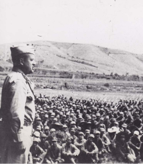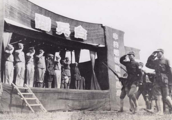在欢迎美国观察组的阅兵式结束后,第359旅的士兵聆听叶剑英将军讲话。阅兵台旁距相机最近的白色条幅上写着“我们衷心祝愿美国观察组身体健康”。旁边柱子上的流行口号是“消灭法西斯主义”,阅兵台上方的中文字是“阅兵台”,另外一侧柱子上的口号是“中美苏英团结起来”。