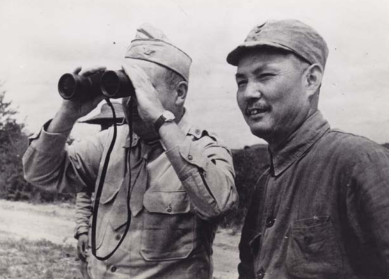 美军观察组组长戴维·D·包瑞德上校手持双筒望远镜观看第359旅的一支部队进行演习。第18集团军参谋长叶剑英将军站在一旁。