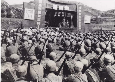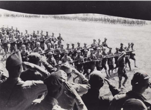 第359旅士兵列队通过阅兵台时,参谋长叶剑英将军和旅长王震将军、戴维·D·包瑞德上校及美军观察组成员向阅兵队伍回礼。