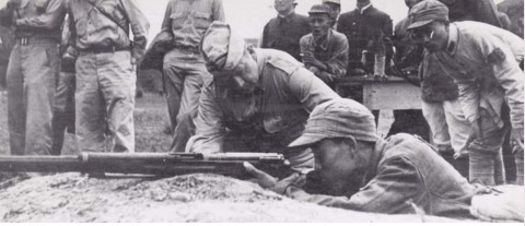 戴维·D·包瑞德上校在旅步枪靶场向一名步兵提出建议。这些步枪之前属于日本军队。第359旅的装备大多数都是从日军那里夺获的。