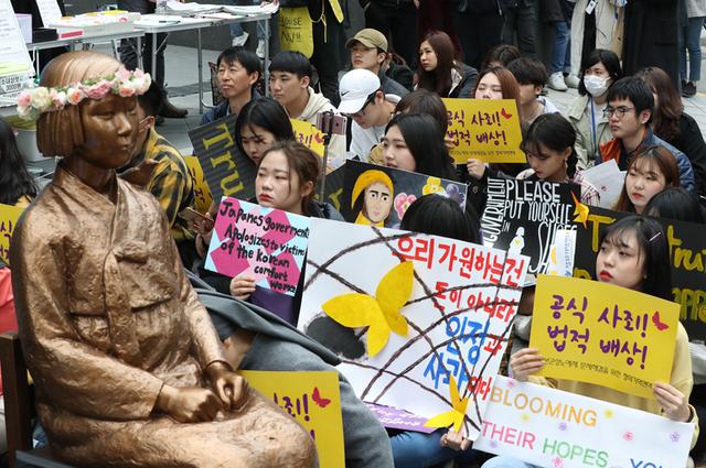当地时间2019年3月27日,韩国首尔,韩国示威者举行在日本驻韩大使馆附近,举行第1380次例行集会,敦促日政府解决慰安妇问题。