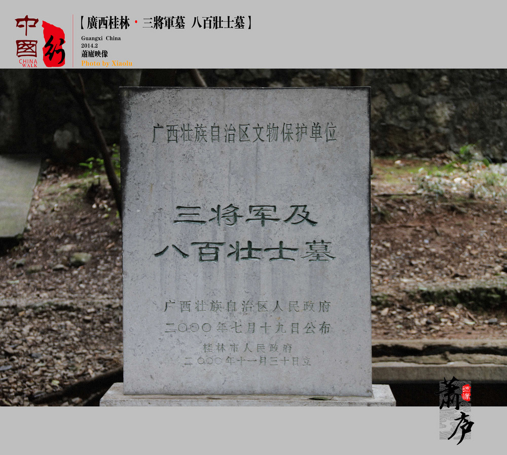 上图为广西壮族自治区文物保护单位的三将军及八百壮士墓石碑正面。