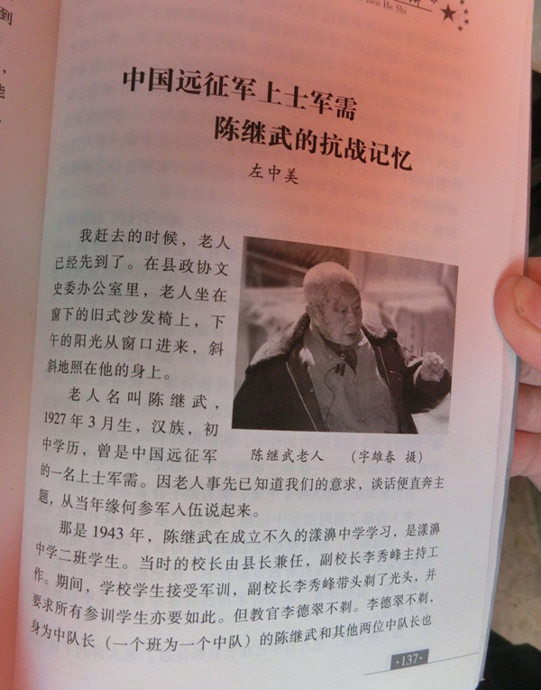 身体情况:陈继武老人今年已87岁高龄,除有“老毛病”高血压、冠心病和轻微脑萎缩以外,身体状况平稳。老人心态乐观,精神矍铄,经常看报、锻炼,谈话期间还一连为我们演唱了四首当年的抗日军歌,甚至还拿出洞经的乐器,为我们表演了几个洞经乐曲小段。