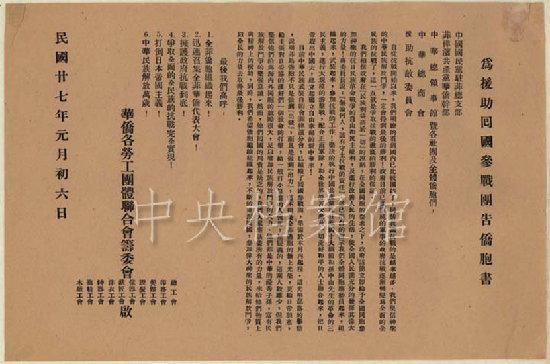 1938年1月6日:华侨各劳工团体联合会筹委会总工会等为援助回国参战团告侨胞书