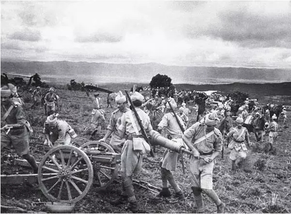 在天空盟军机群的轰呜声中,来自东非,西非的黑人士兵,来自喜马拉雅山麓的印度士兵,尼泊尔士兵陆续通过,在他们身后是强大的炮兵和装甲集群。
