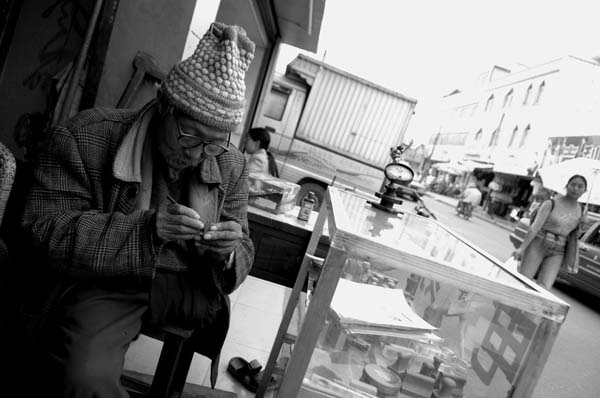 在腾冲街头,左腿高位截肢的郭自益(82岁,云南腾冲人,原远征军11集团军滇康缅游击二区中尉)仍在街头以篆刻谋生。
