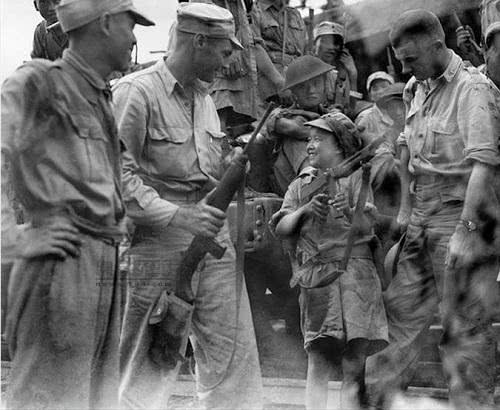后来英国钢盔全被他们全扔了,宁可不戴钢盔,因为戴它没有用。天热的时候戴帆布做的通帽,软硬适宜,跟他们的军便服是一样的土黄色,很漂亮。不热了,就戴自己的军帽。他们都有美国钢盔,不是发的,跟美国佬买的,美国佬连手枪都能卖何况一个钢盔。也有些人给都不要,嫌沉。美国钢盔可以烧水、做饭、做菜,英国钢盔不行,很圆很深,还是铁的。