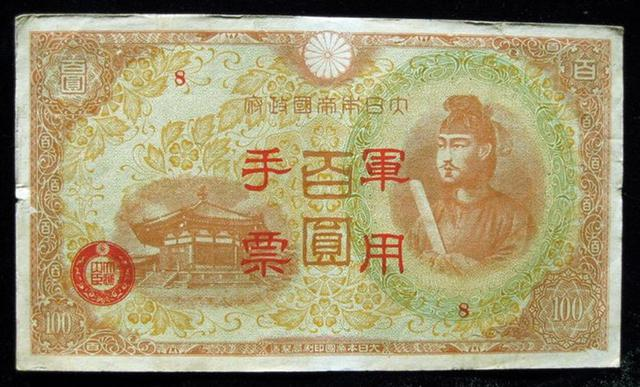 据资料记载,抗日战争期间,日军通过发行这类“纸币”,从中国掠走的财富达上百亿美元。据载,在不同时期,日本军用手票分为“甲、乙、丙、丁、戊”五种票号。图为百元票。