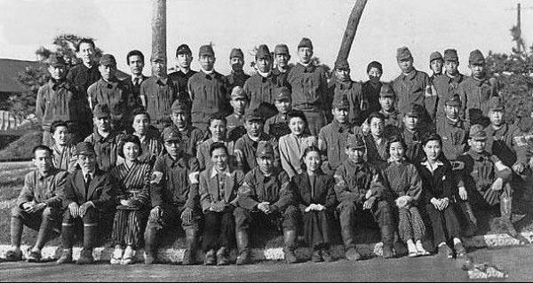 1945年,日本东京244战队本部前,战队机械师与慰问团的合影。