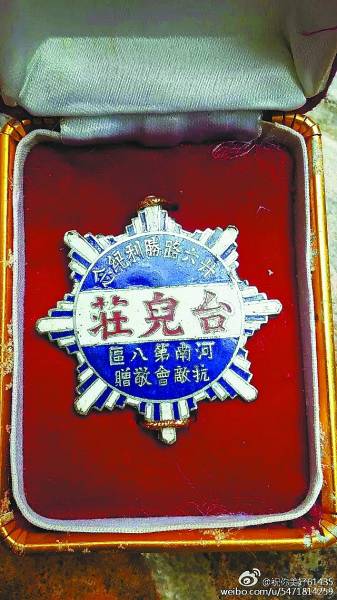 黄珏一老人参加台儿庄战役后获得的纪念章,上写有“河南第八区抗敌会敬赠二十六路胜利纪念章”字样。