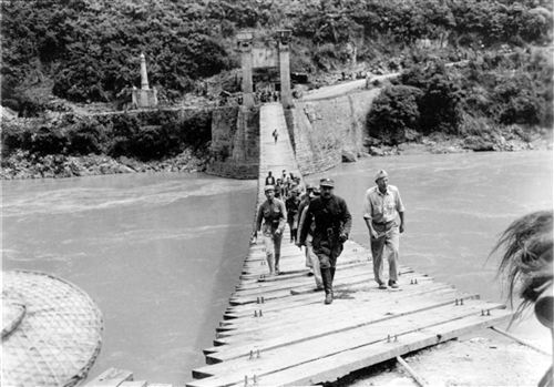 在美国国家档案馆的老照片珍藏着一张老照片,是1944年7月8日中国远征军总司令卫立煌和美军哈里·凯恩上尉走过刚刚抢通的惠通桥时拍摄的。从这张照片可以看出,因东岸被炸毁的桥塔还未恢复,此时的桥面仅3根钢索承重,上面铺着木板,连护栏都没有,承载力仅供人行,车辆无法通过。即便如此,惠通桥也在发挥作用,大量的武器、弹药以人背马驮的方式,由此运上松山前线。
