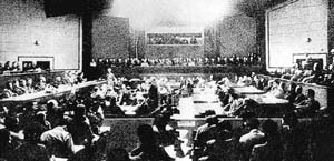 东京军事法庭审判日本甲级战犯情景。正对面是审判官席,右方为被告席,中央为证人席。
