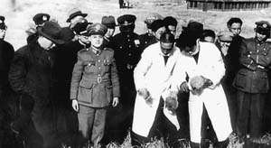 中国军事法庭庭长石美瑜、检察官陈光虞等在检验遇难者尸骨。