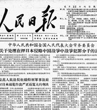 一九五六年《人民日报》关于全国人大常委会处理在押日本战犯决定的报道(剪报)。