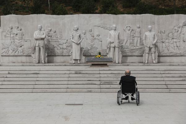 4月16日,北京,陈明忠先生坐着轮椅在西山附近的无名烈士纪念广场前缅怀逝去的故人。 澎湃新闻记者 李坤 图