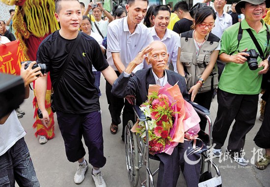 上午12时,接送杨剑达的车终于到了。梅州网志愿者首先向老人献花,用客家话对老人说:“家乡人民欢迎您回家!”久违的乡音让老人哽咽。老人一路向站在两旁的志愿者们敬礼。其间,还对欢迎他的客家特有的舞龙舞狮情有独钟,拿过狮头舞了一小会,笑得像一个孩子。