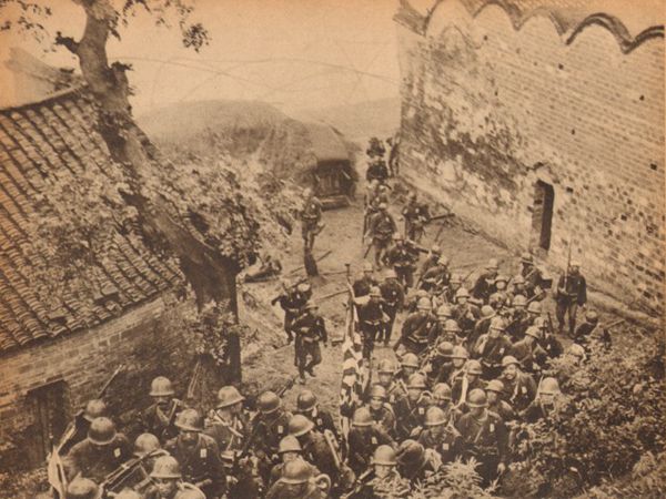 1938年6月12日,冒雨登陆的日军海军陆战队占领安庆长江边江防设施 。
