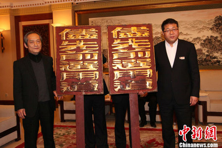 台湾抗日亲属协进会创会会长林光辉(左),代表雾峰林家向北京中国人民抗日战争纪念馆捐赠了先辈林朝栋的两块功名牌,以及1874年日本侵台时,台湾排湾族群御敌时所使用的弓箭等文物。中新社发 陈小愿 摄