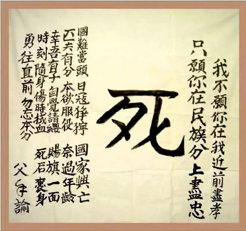 1938年底,北川县曲山镇老人王者成,送子王建堂从军,并赐“死”字大旗的事迹,激励了多少爱国青年和仁人志士。这面白布制成的大旗中央,写着一个斗大而苍劲有力的“死”字;左右两侧写着这样的几行小字: